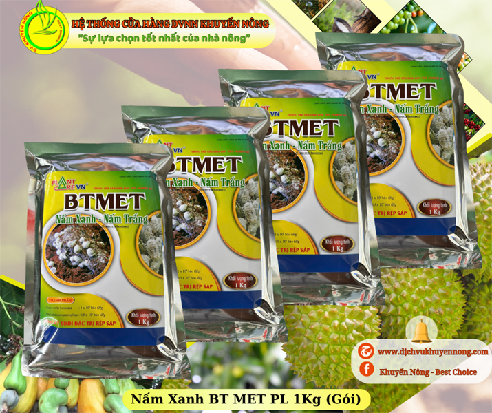 + Nấm xanh: tên khoa học Metarhizium anisopliae (Metsch), chúng được phân lập từ những loài côn trùng bị nhiễm bệnh và được sản xuất bởi công nghệ lên men. Loại nấm này phòng trừ hiệu quả các loại côn trùng gây hại thuộc bộ cánh phấn, cánh cứng, cánh thẳng....